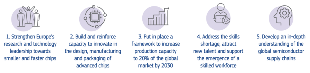 | The EC has proposed a package of measures under the umbrella term 'European Chips Act' 'to ensure the EU's security of supply, resilience, and technological leadership in semiconductor technologies and applications'. The package's overall aim is to enable the EU to reach 20% of the global chips market share (to double today's roughly 10%). The package contains a proposal for a new regulation, a communication statement outlining a European chips strategy, and a recommendation for member states. The package outlines five key goals. |