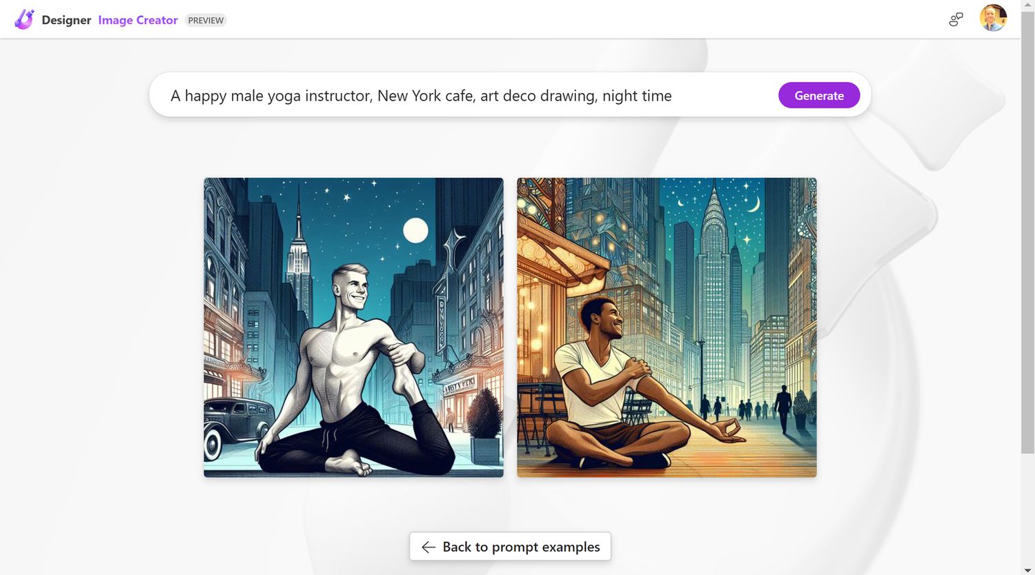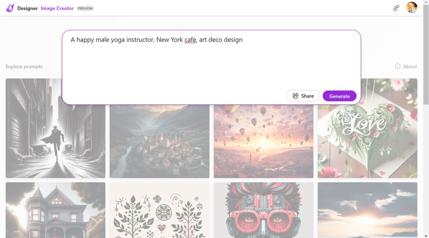 Enter your AI image creation prompt in the form of descriptive keywords and phrases separated by commas. For this example, we'll use "A happy male yoga instructor, New York cafe, art deco design."