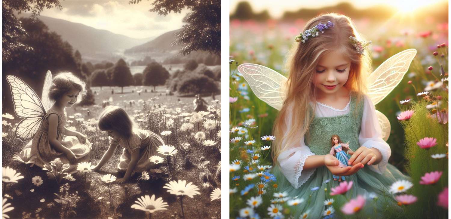 For example, both of the above images were generated using the prompt "a young girl playing with a fairy, flower meadow, daytime," but the left image's prompt includes the year "1930," and the right one's has "2024."