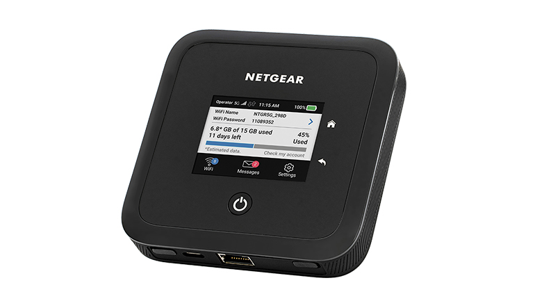 The Nighthawk M5 measures 105mm (4.14in.) square and is 21.5mm (0.85in.) thick. It has a 2.4-inch LCD touch screen, a power button, a USB-C port and an RJ-45 Ethernet port. There are also two TS-9 connectors for use with external 5G/4G/3G antennas.