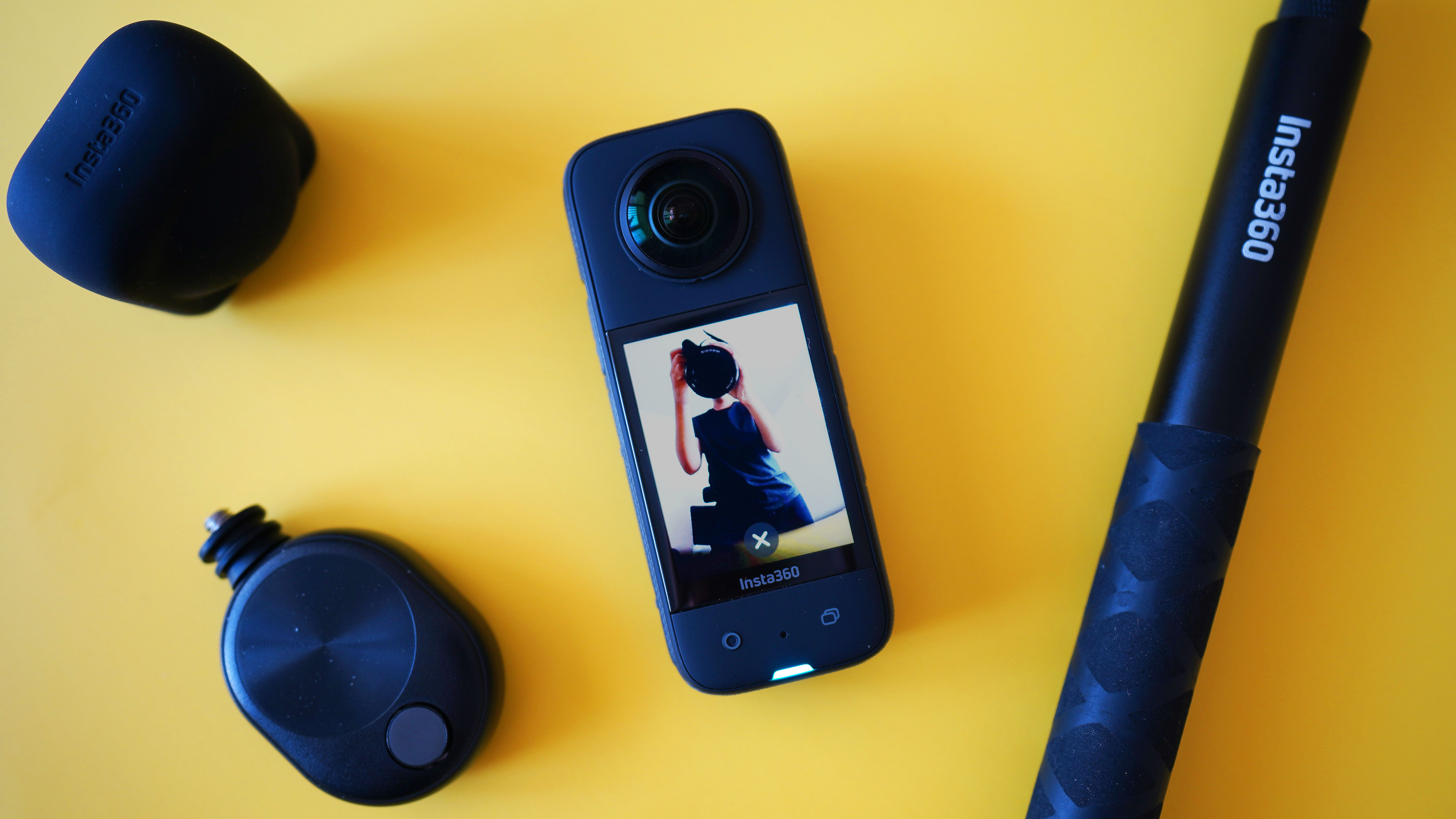 From left to right: Lens cap, Bullet Time cord, Insta360 X3, and the invisible selfie stick.