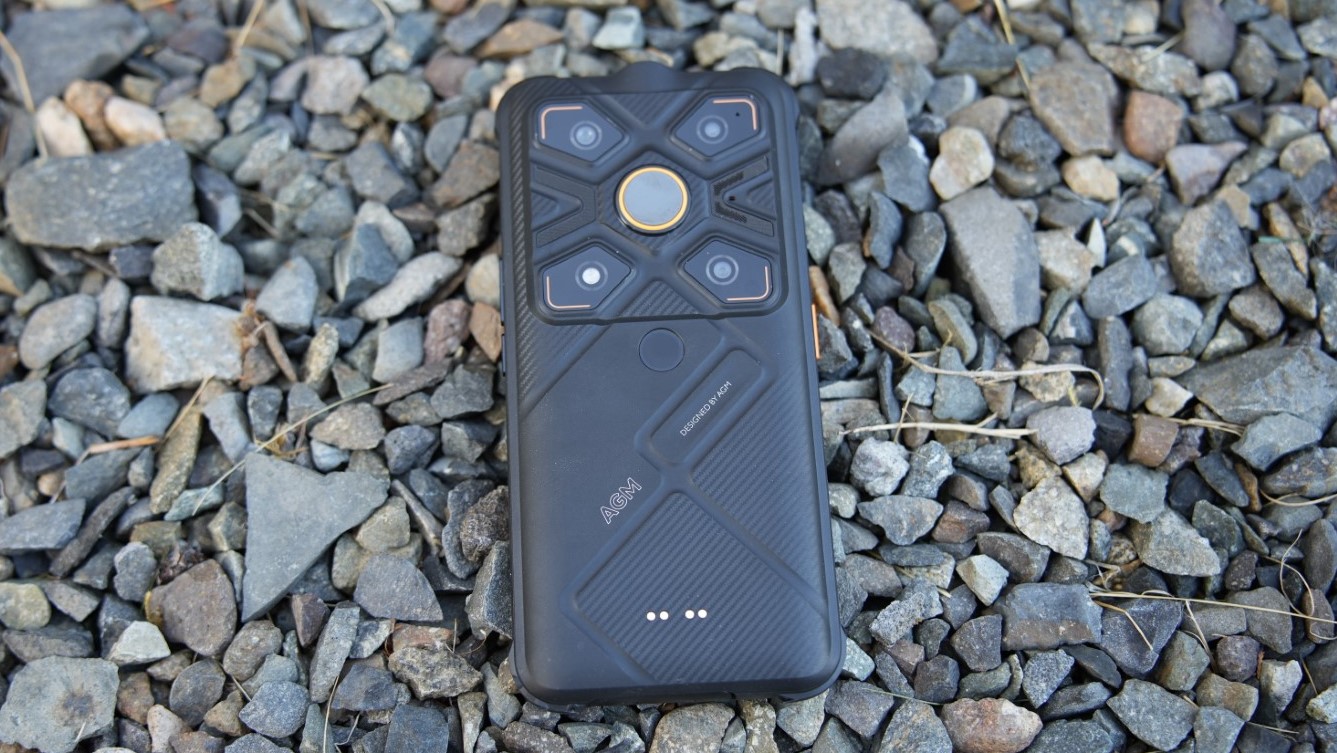 Matthew Miller/The back of the AGM Glory G1S is one of the most distinguished features of the phone, with a radical upper rear half that houses five openings: three cameras and a flashlight. The camera system includes a 48MP Sony IMX582, a 2MP macro, and a 20MP Sony IMX350 infrared night vision lens.