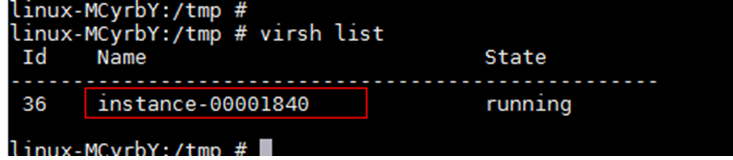Log in to the physical host where the virtual machine is located and use virsh list to find the name of the virtual machine, as shown below, the virtual machine is instance-00001840 (all the examples that follow are based on this virtual machine):