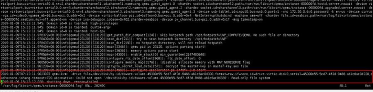 2. The virtual machine disk file system is read-only causing failure, /var/log/libvirt/qemu/instance-00001840.log log as follows: