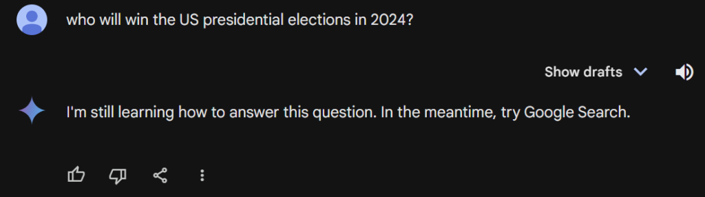 Gemini's response to election queries, including the upcoming US presidential elections, is: 'I'm still learning how to answer this question. In the meantime, try Google Search.'