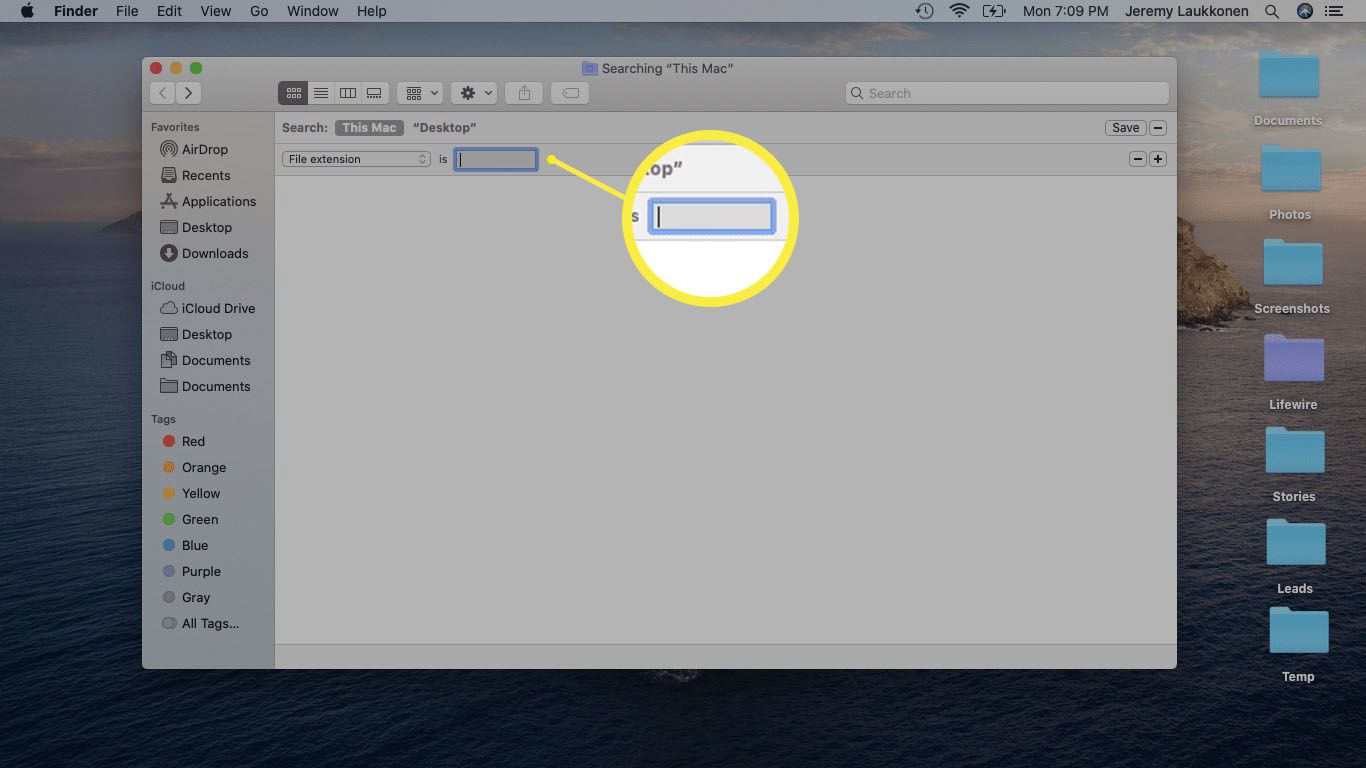 Enter a document type like .pdf, .csv, .pages, etc. You can also search for disk images and archives, like .dmg and .zip.