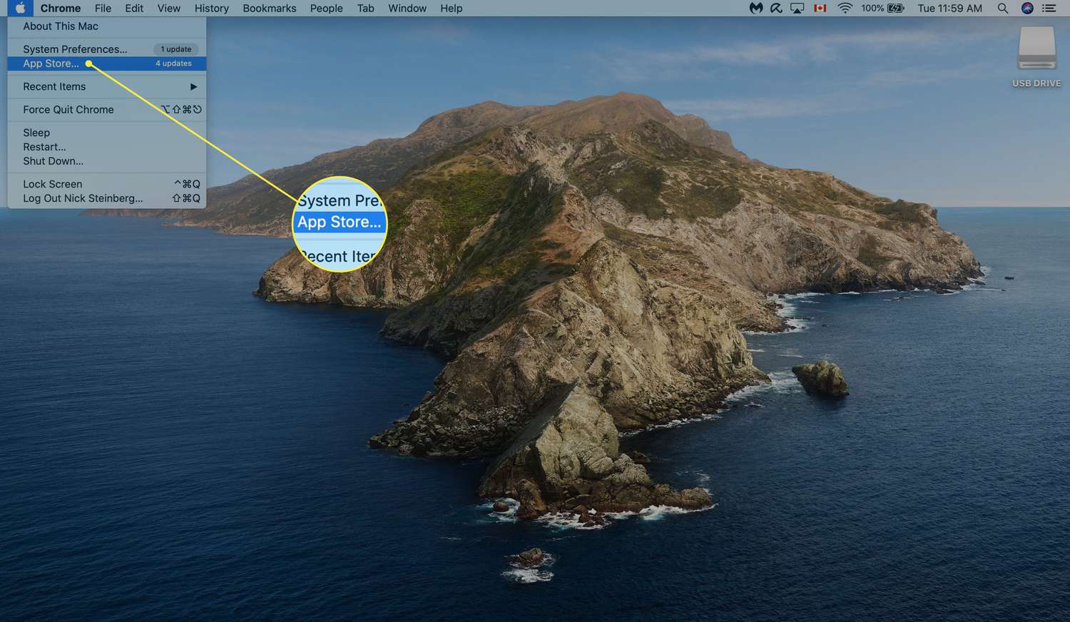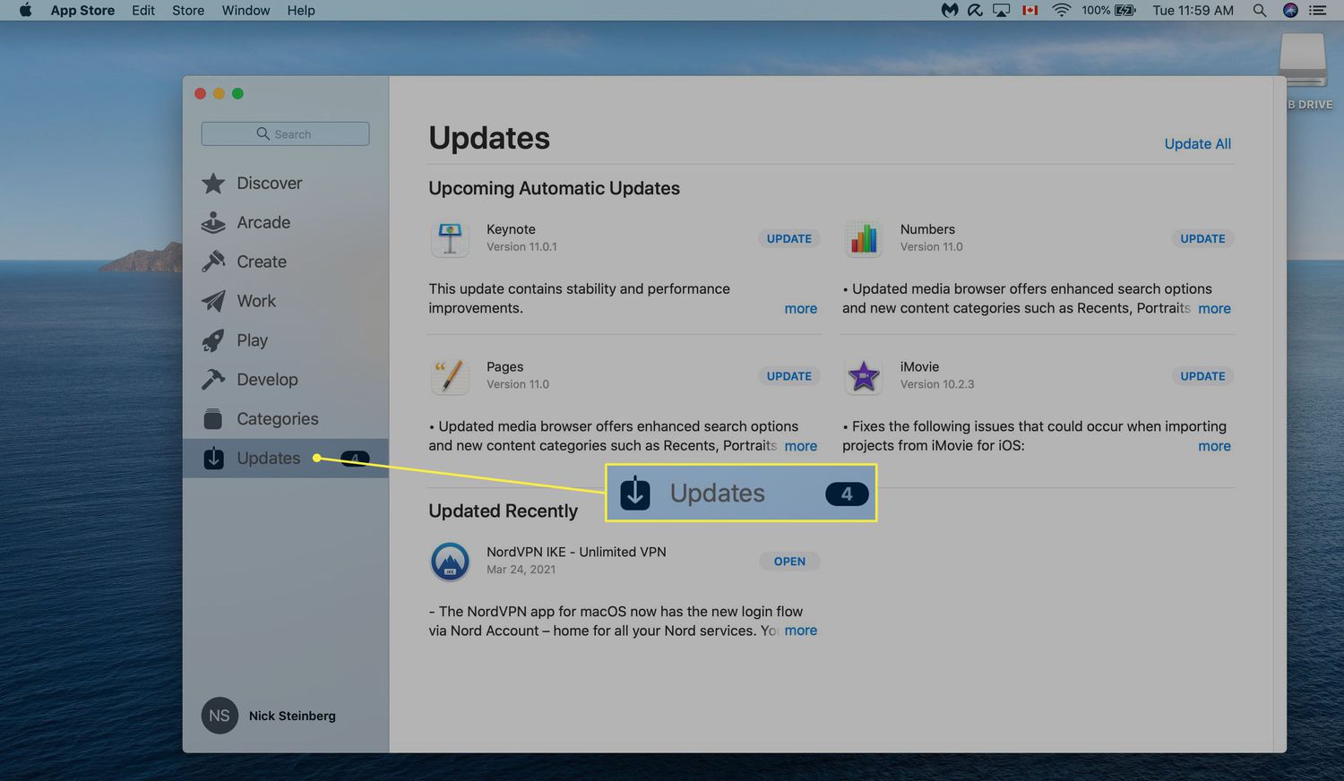You can keep your software updated on a Mac using the App Store. Open the Apple menu to see if you have any updates available, then select App Store if you do. Once the App Store opens, select Updates.