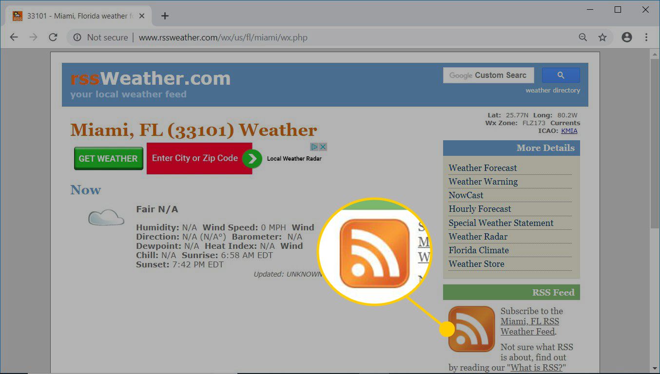 To find an RSS feed on a website, look on the site's main or home page. Some sites display their RSS feed as an orange button that may contain the acronyms RSS or XML.