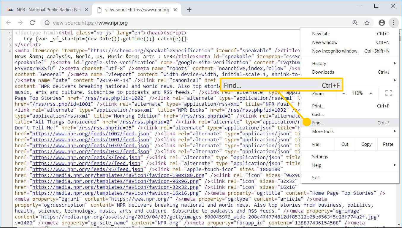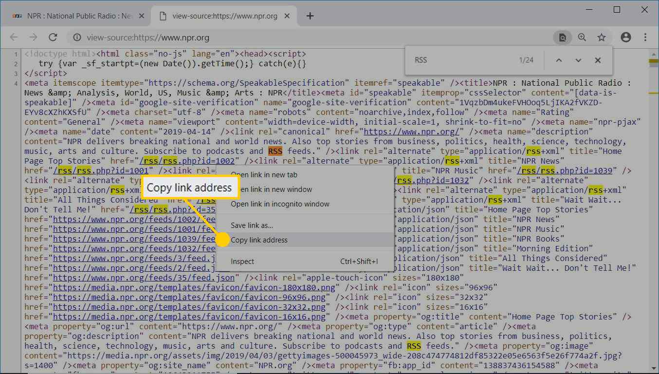 If you don't see the RSS icon or link, examine the page source of the web page. Here's how to view the page source in Chrome and get an RSS link.