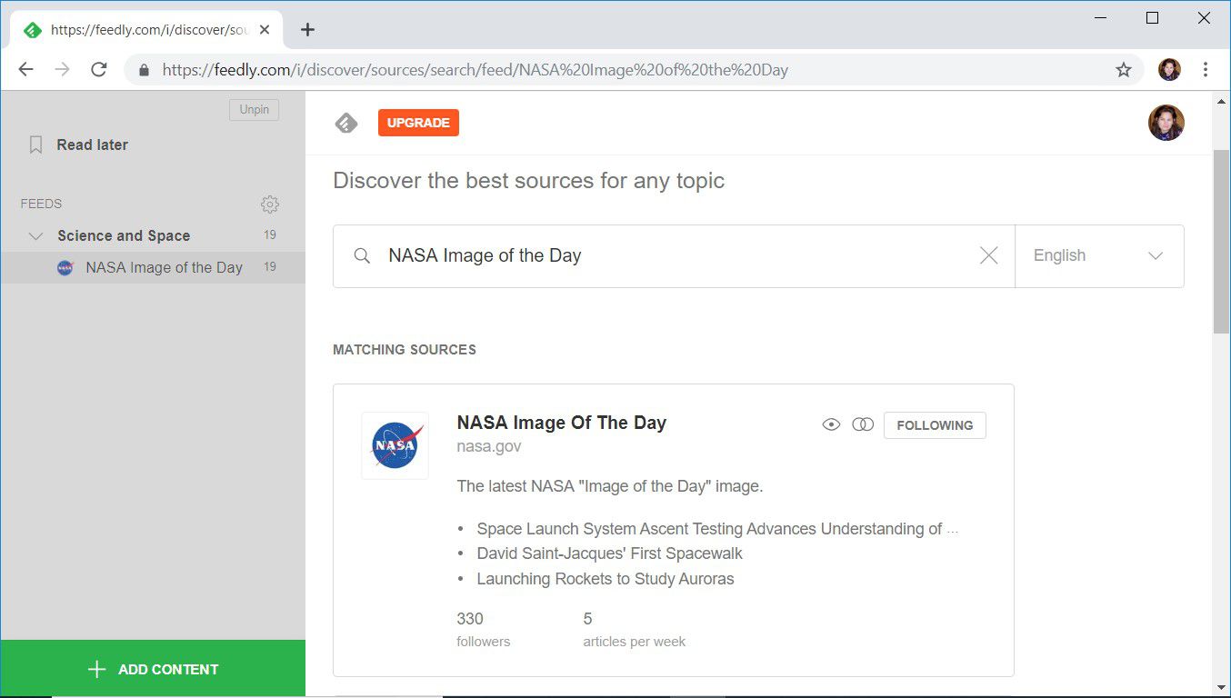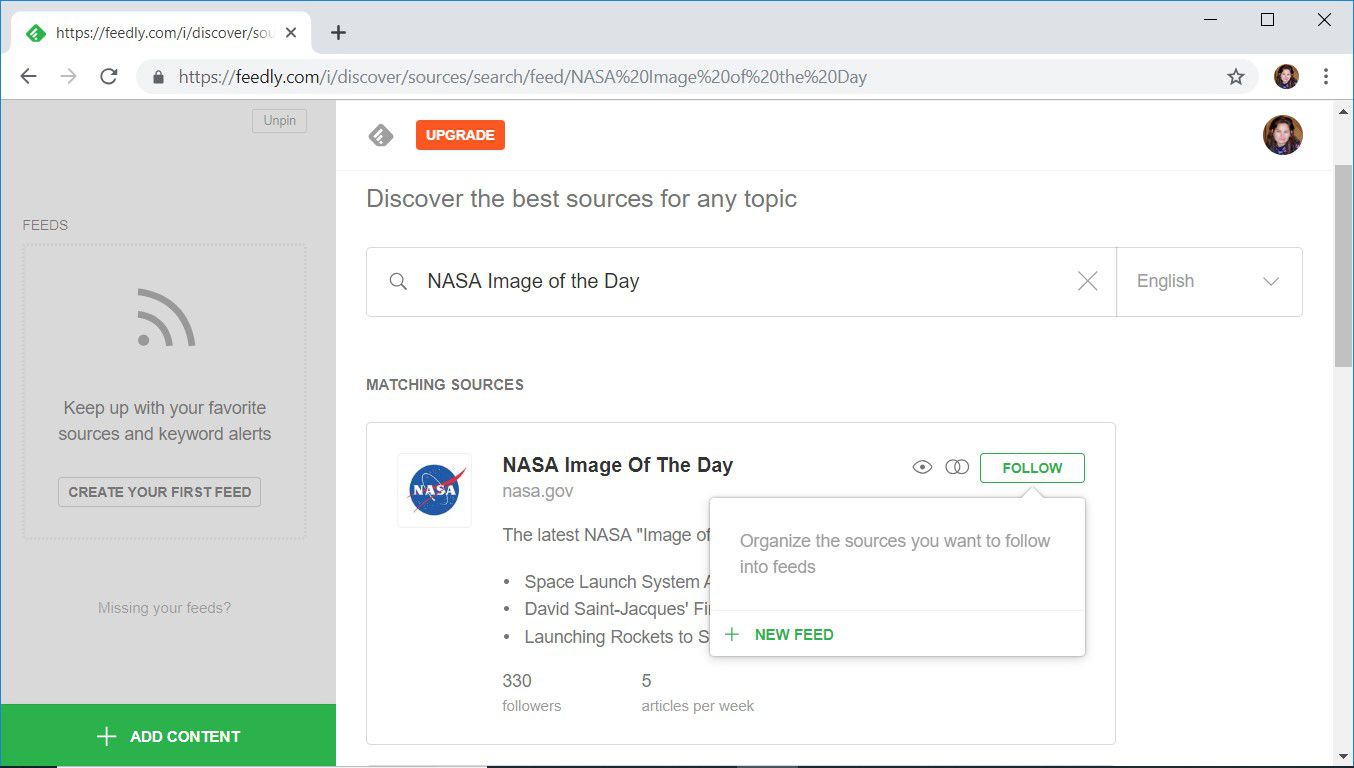 Paste the URL in the Feedly Search box and select the RSS feed from the list of sources.