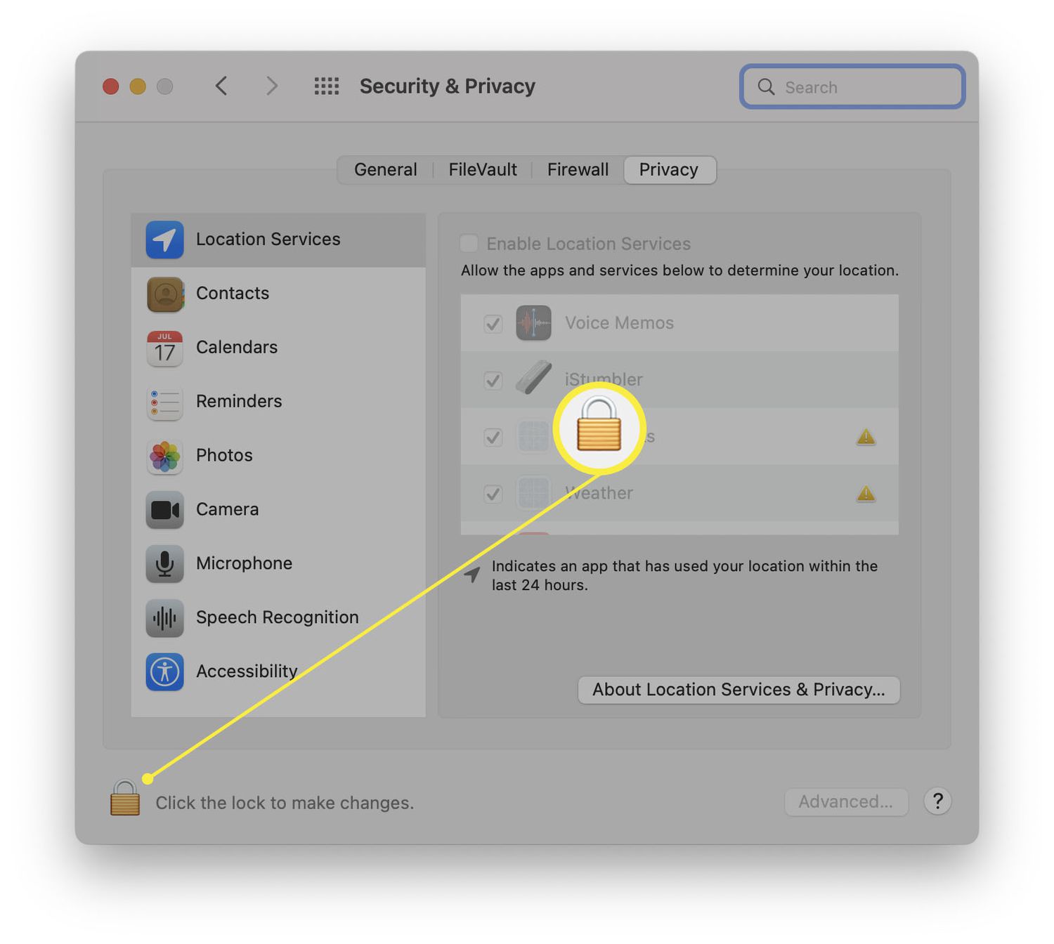 - Apple menu: System Preferences > Security & Privacy > Privacy > Lock symbol > Enable Location Services.