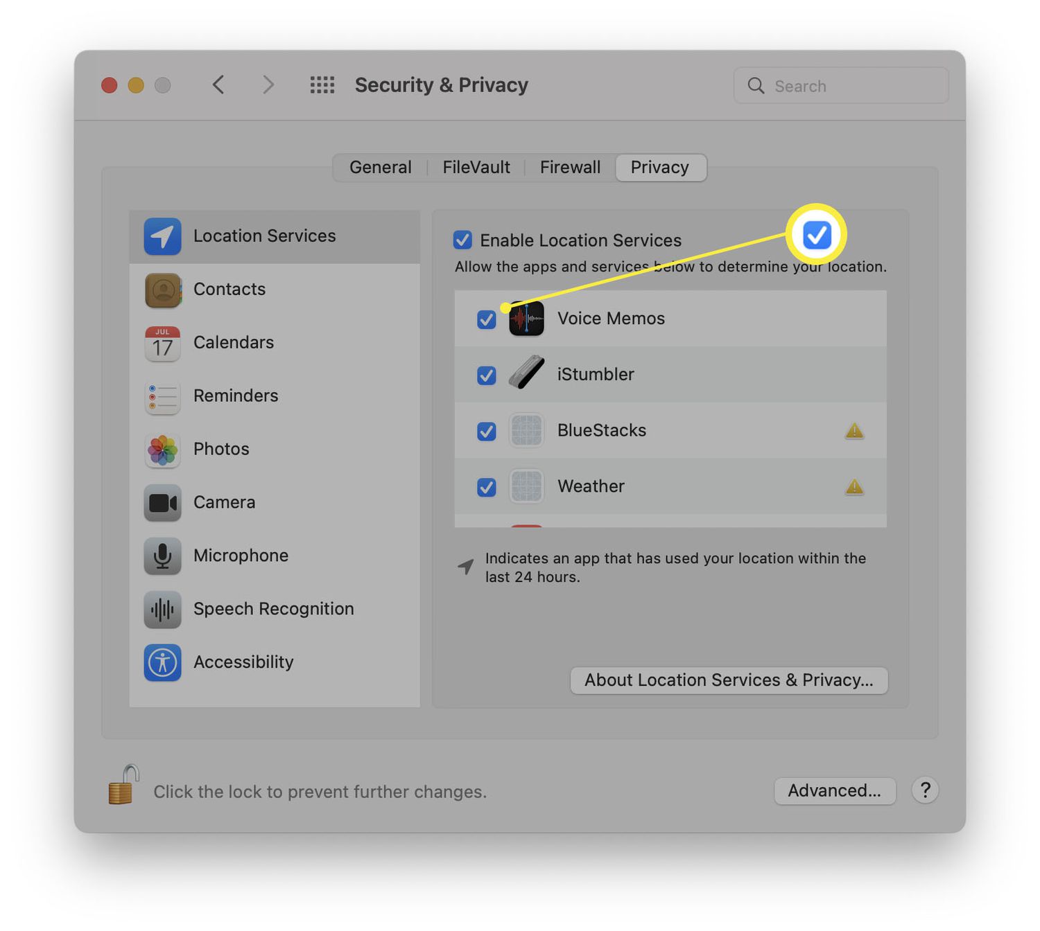 - Change which apps can use Location Services by checking/unchecking the box next to the app's name.