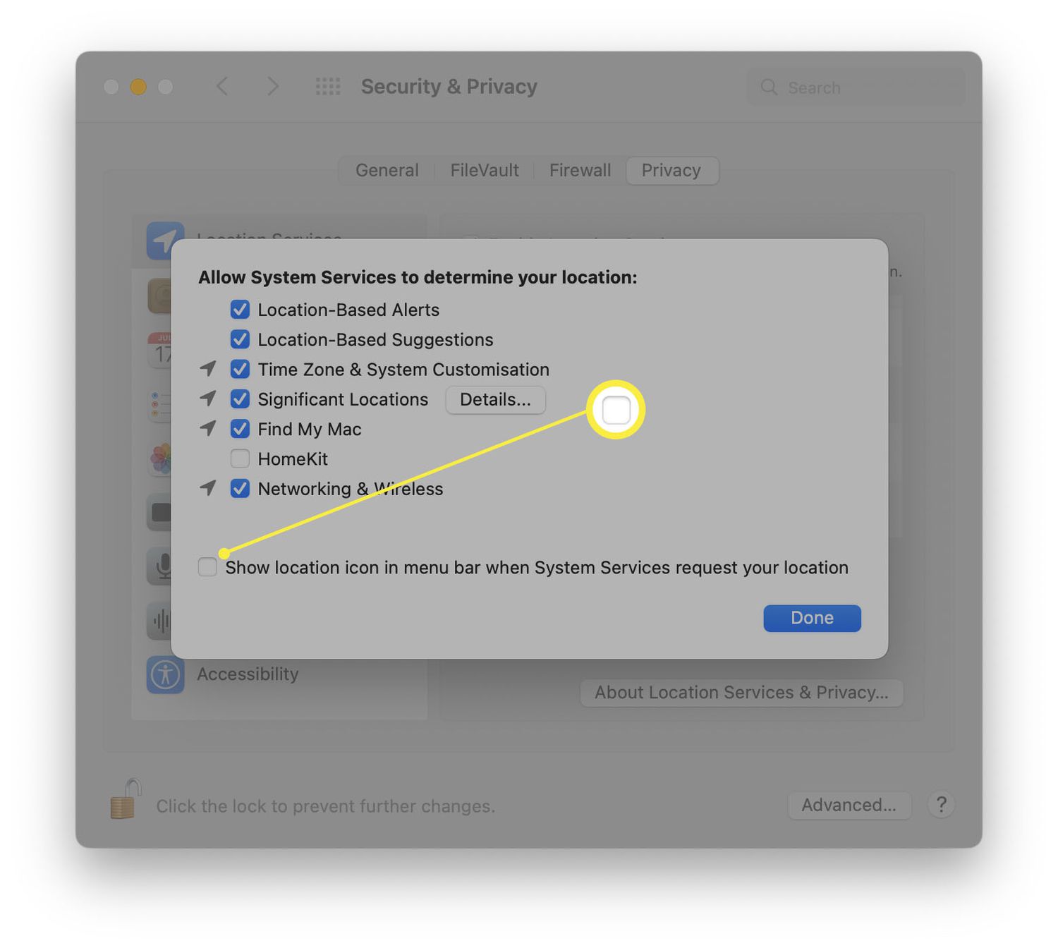 You can also choose to tick or untick other options under Allow System Services to determine your location to change what parts of your Mac can access your location.