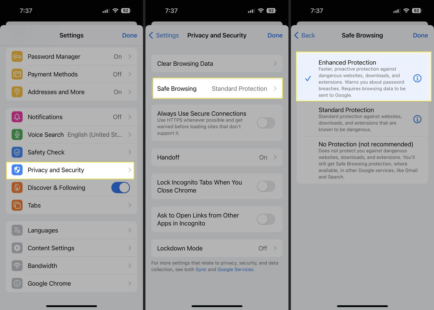 - Mobile: three dots > Settings > Privacy and Security > Safe Browsing and select Enhanced Protection.