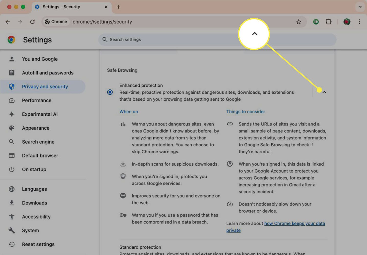 Once you turn it on, the feature works in the background to protect you from malicious websites, dangerous downloads, and harmful browser extensions.