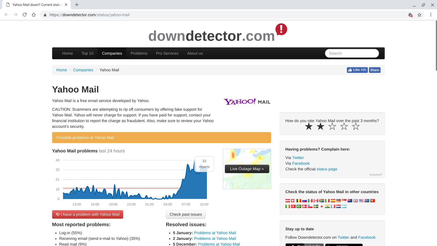 Check third-party status services to see if other sites can't access Yahoo Mail. Open your browser to the service https://isup.me, for example, and enter mail.yahoo.com to see if the site can connect to Yahoo Mail. Alternatively, DownDetector maintains a status page that tracks and reports connection and outage problems for Yahoo Mail at https://downdetector.com/status/yahoo-mail. At any given time, you should expect to see at least a few problems reported. However, if you see hundreds or thousands of issues identified, the problem is almost certainly an issue outside of your control.