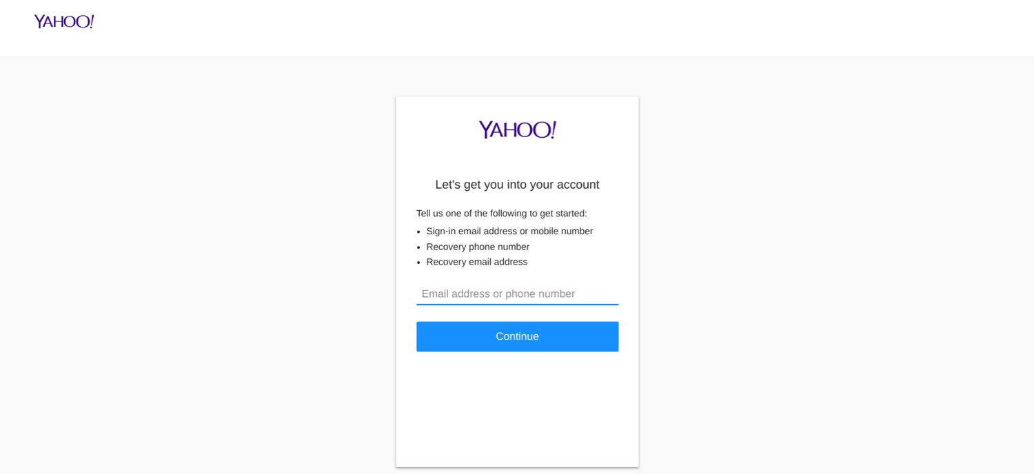 On the Yahoo Mail sign-in page, tap or click on the "Trouble signing in?" link. This will take you to the start of the account access recovery process. On this page, enter any one of four pieces of information to start the recovery process: