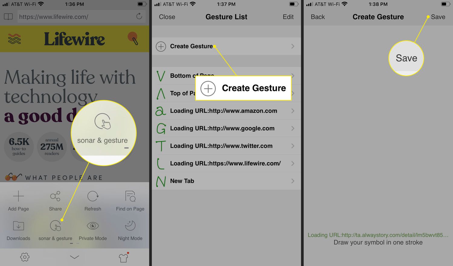 - Tap Add Gesture to create a quick shorthand design to launch a page. For example, create a simple L gesture to launch Lifewire.com.