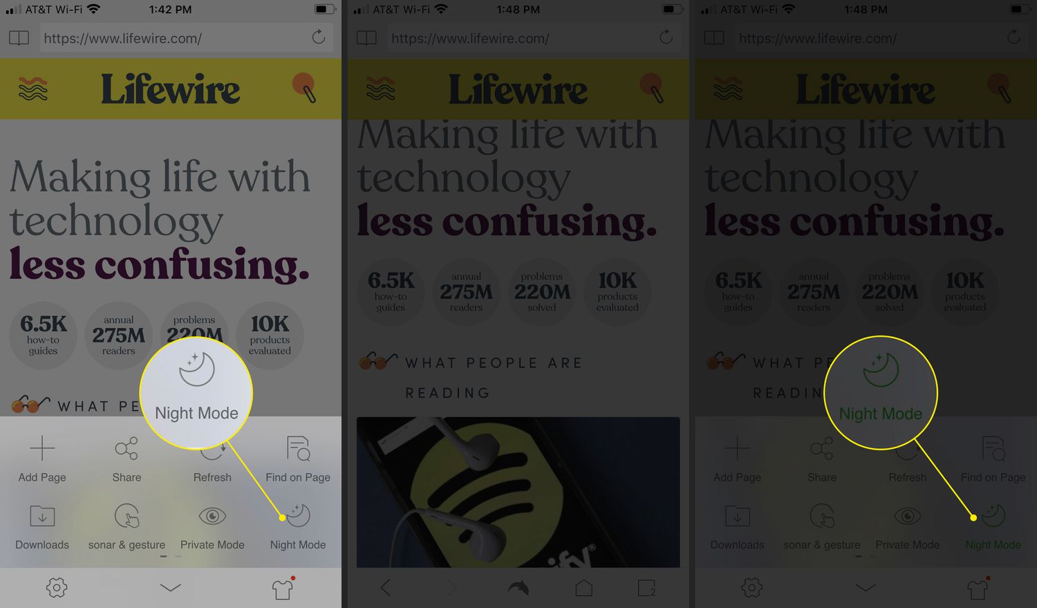 Tap Night Mode to dim the screen to prevent eye strain when browsing in the dark. Tap Night Mode again from the menu to go back to normal.