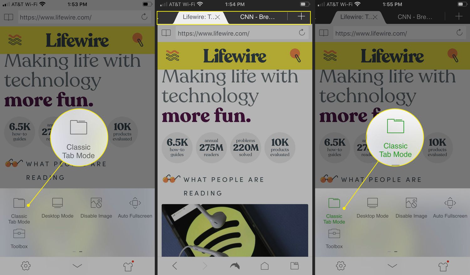 Tap Classic Tab Mode to display all open tabs at the top of the browser window, similar to a desktop browser. Tap Classic Tab Mode again to revert to normal.