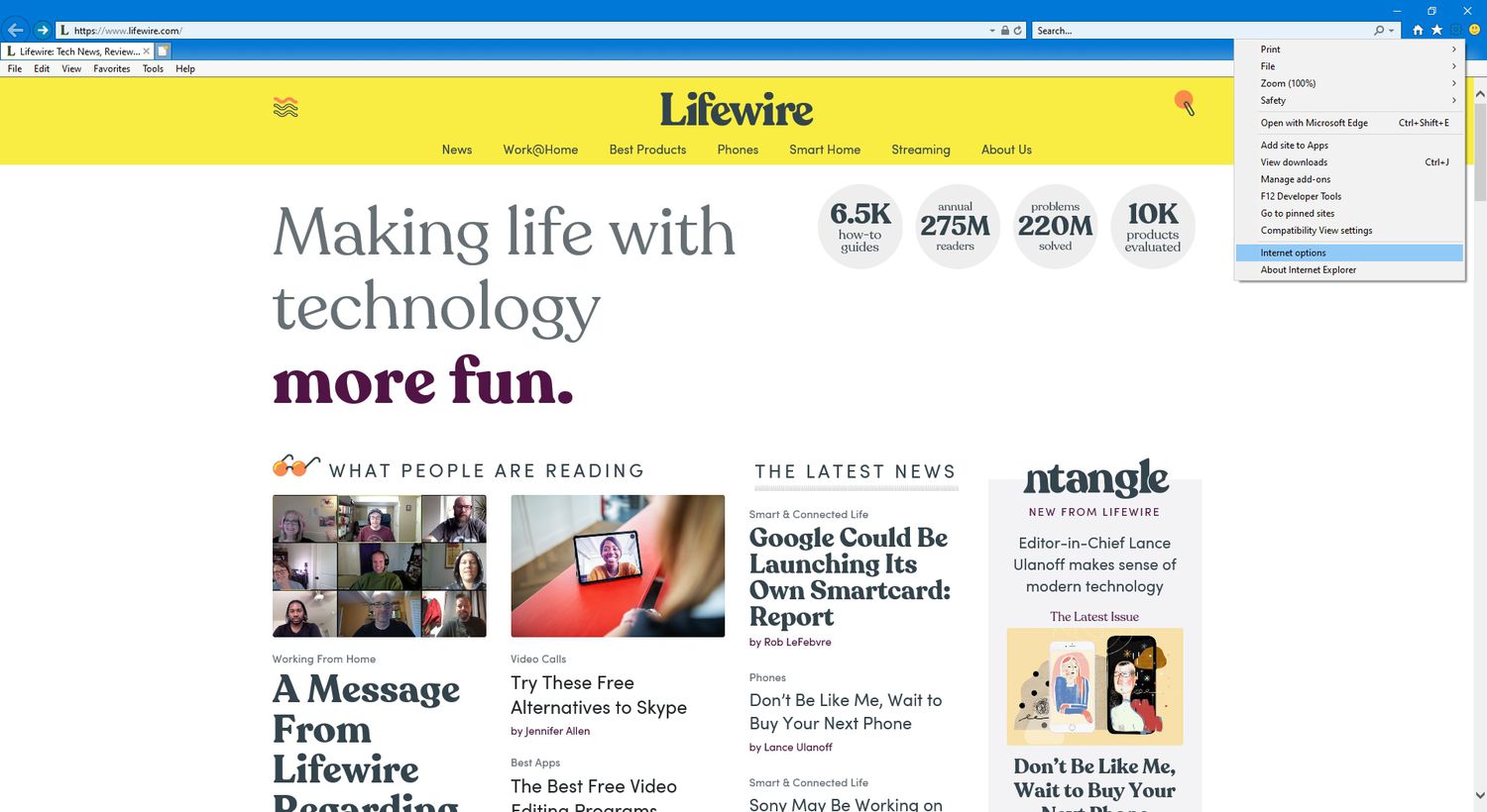 When the drop-down menu appears, select Internet options to display IE11's internet options in a window overlaying your browser window.