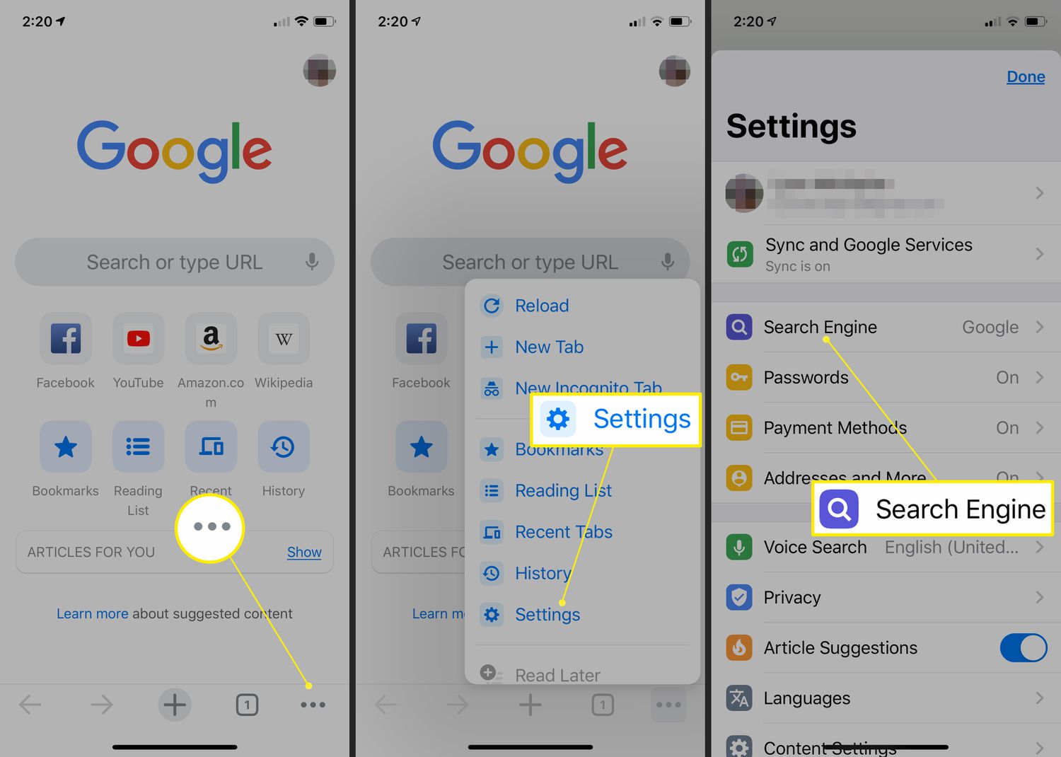 - Tap the Chrome menu button (three dots), then tap Settings > Search Engine. Choose from Bing, Yahoo, DuckDuckGo, or Ecosia.