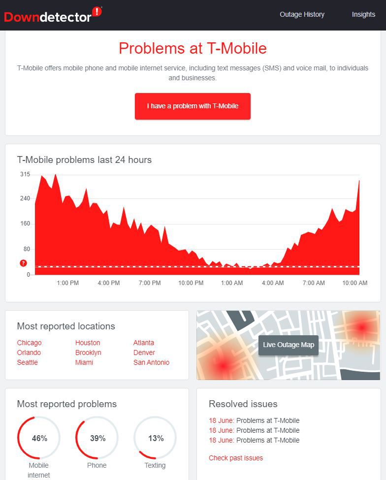 Check the Problems at T-Mobile page on Downdetector.com. This page not only shows you whether there is a problem right now but recent past issues, a live outage map, and the most reported kinds of problems occurring. Another quick place to check is the T-mobile.com Status page at downforeveryoneorjustme.com.