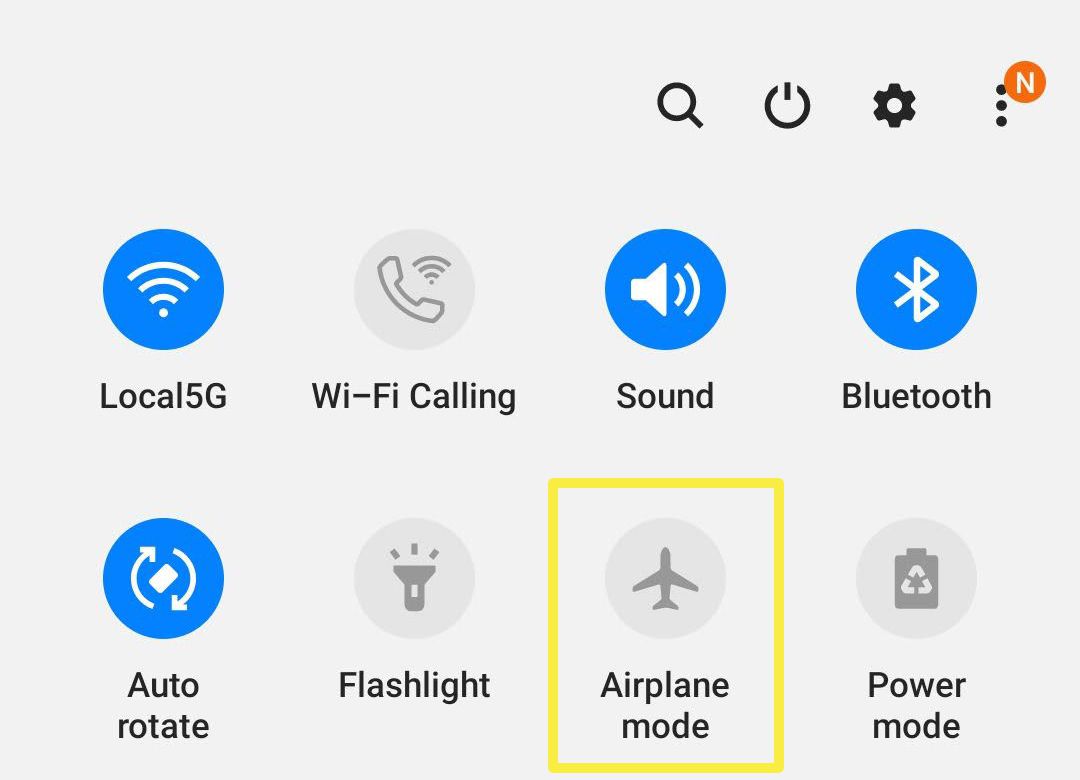 On Android phones, swipe down to renewal the setting menu. If Airplane mode is not active, the icon will be greyed out. If it's not, tap it to turn it off.