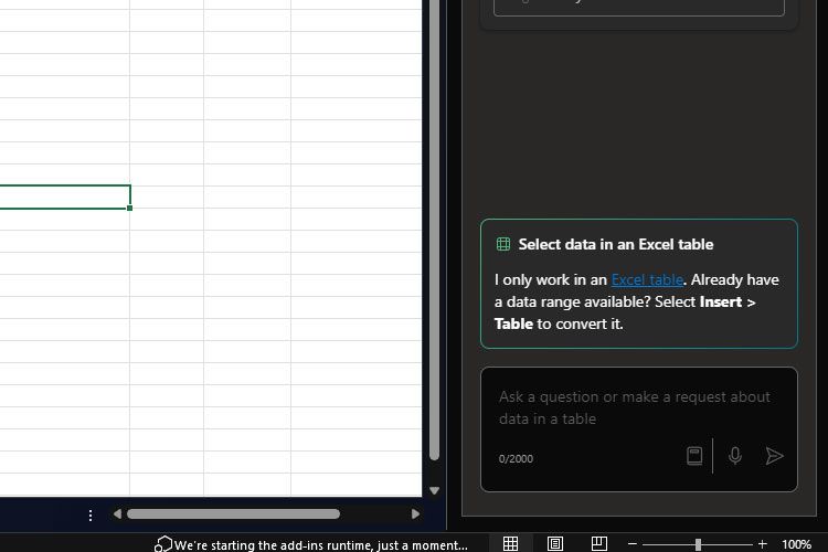 If you can launch Copilot in Excel, but find that it won't let you input any requests, it may be because you haven't selected any data for it to work with. Unlike Copilot in other Microsoft 365 applications, like Word and Powerpoint, Copilot in Excel is designed to only work with data, rather than the entire document. You'll need to select the cells you want it to work with before inputting your request.