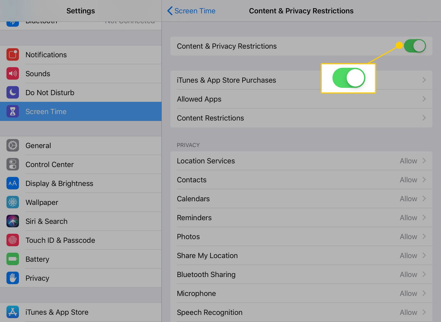- Tap iTunes & App Store Purchases > In-app Purchases > Don't Allow.