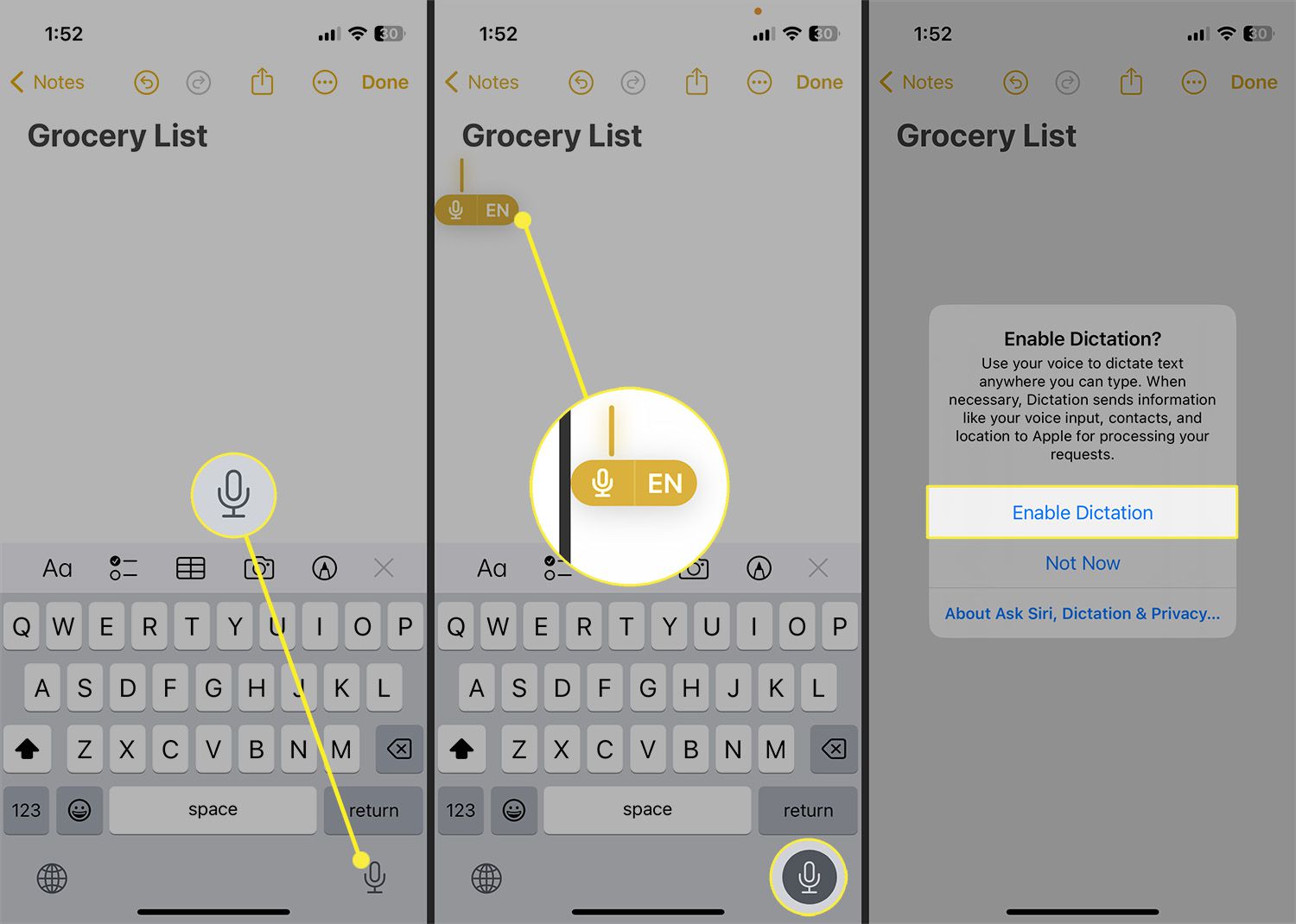 You may be prompted to enable dictation even if you turned it on from Keyboard settings. Tap Enable Dictation to confirm.