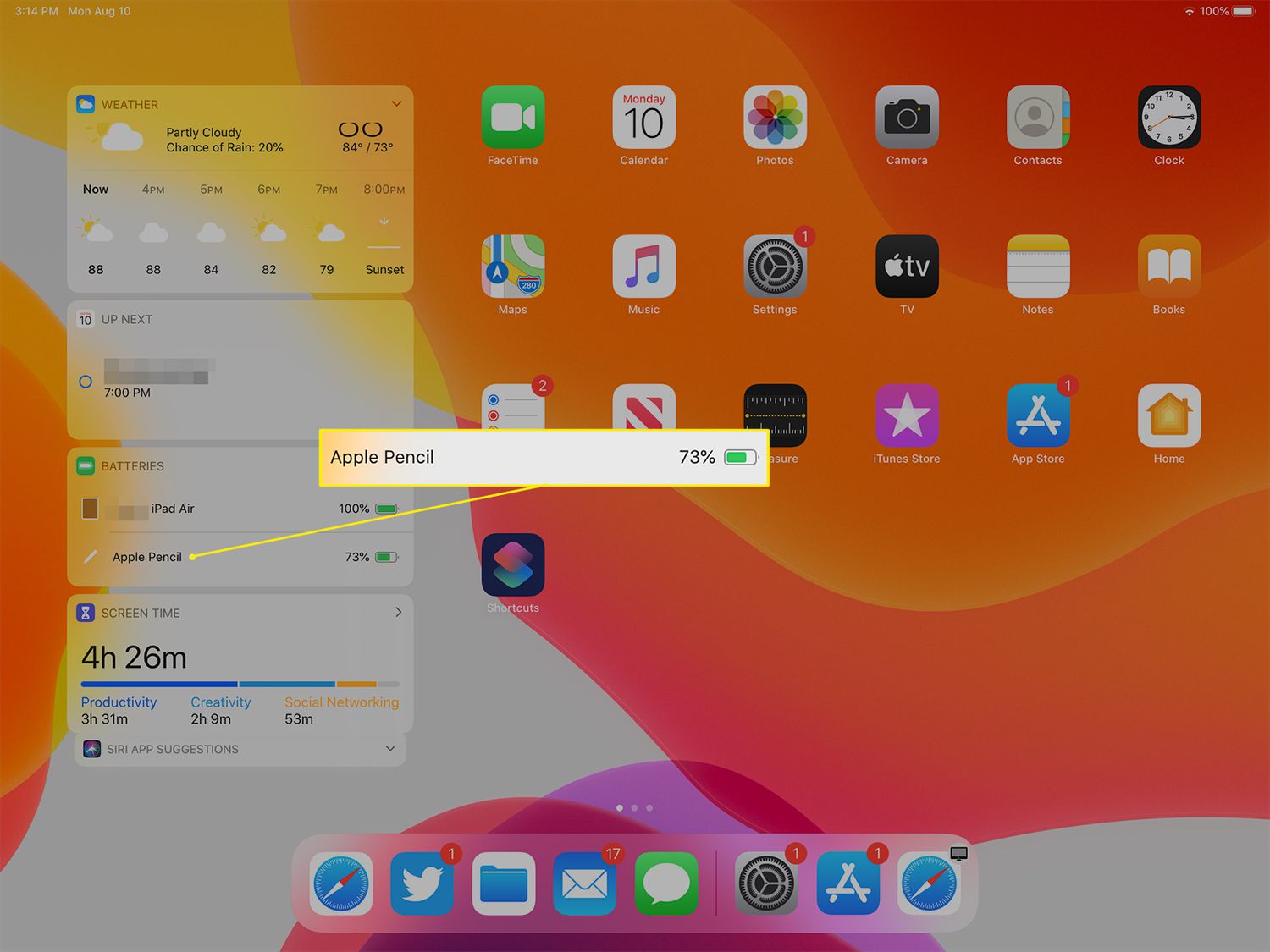 Check the Widgets view on your iPad for the battery status. You can find widgets in the Today View. To get there, swipe right on the Home screen, the Lock screen, or while you're looking at your Notifications.