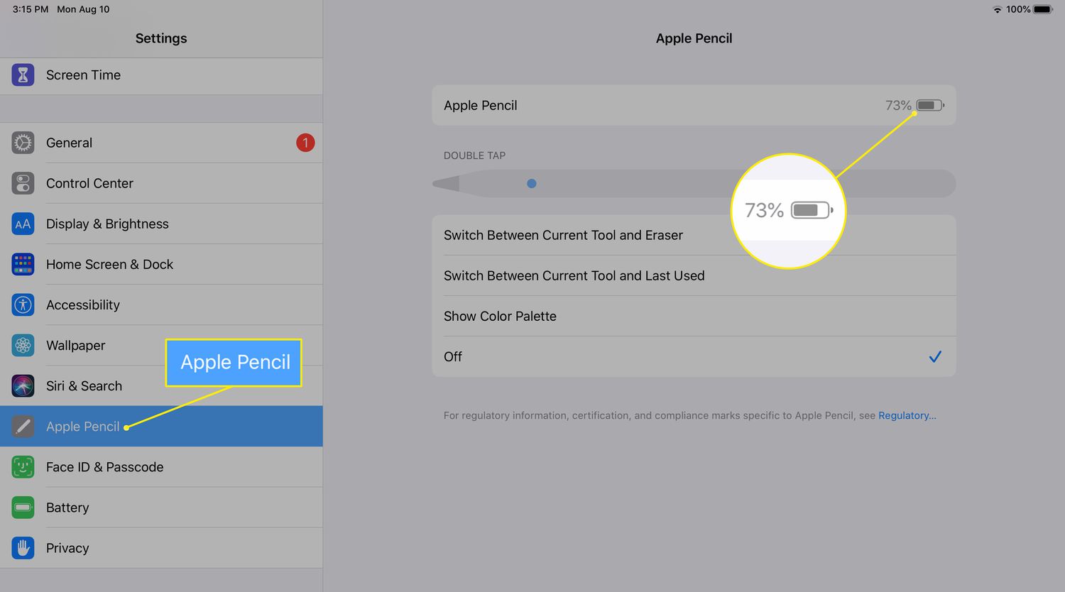 You can also check the battery status by selecting Settings > Apple Pencil and looking for the charge at the top of the main screen.