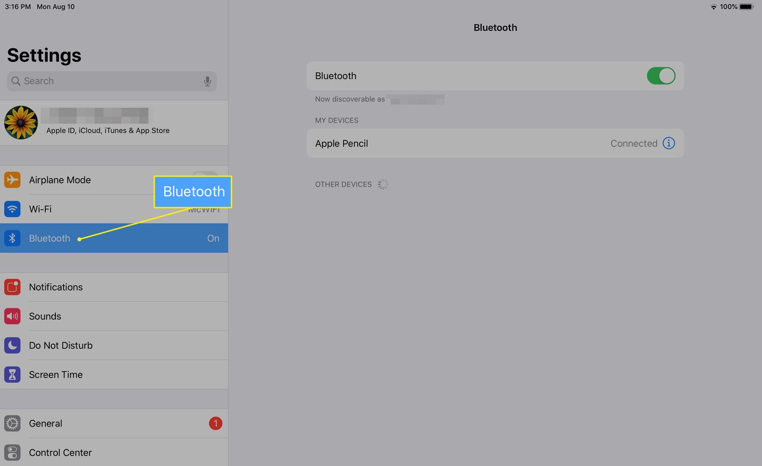 Tap Bluetooth. Tap the toggle switch to turn on Bluetooth if it isn't turned on. You should see your Apple Penci in the My Devices section if it is paired with the iPad.