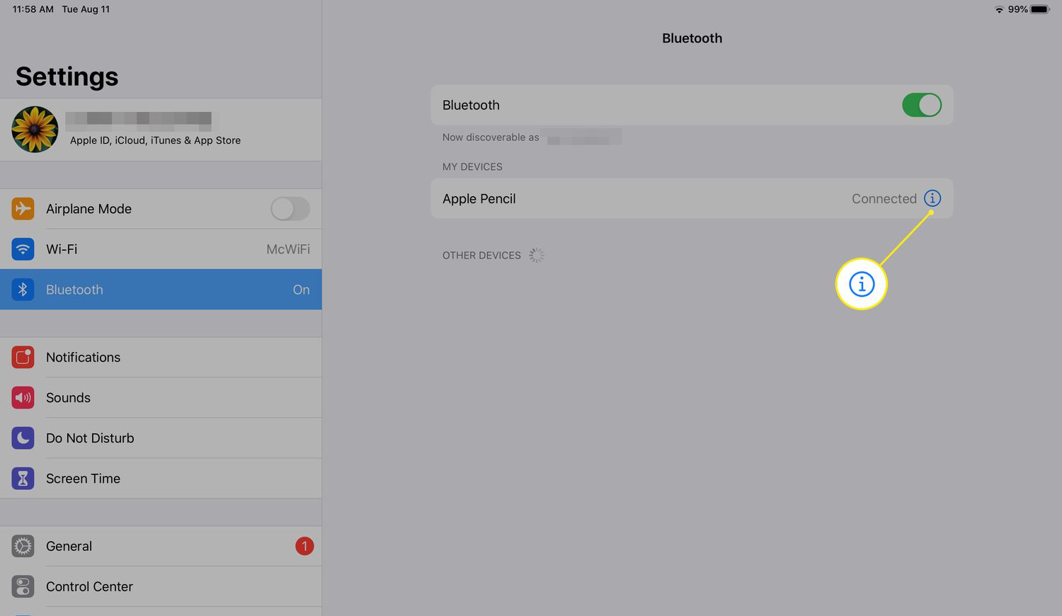 Tap the information icon (the i in a circle) next to Apple Pencil in the Bluetooth settings screen.