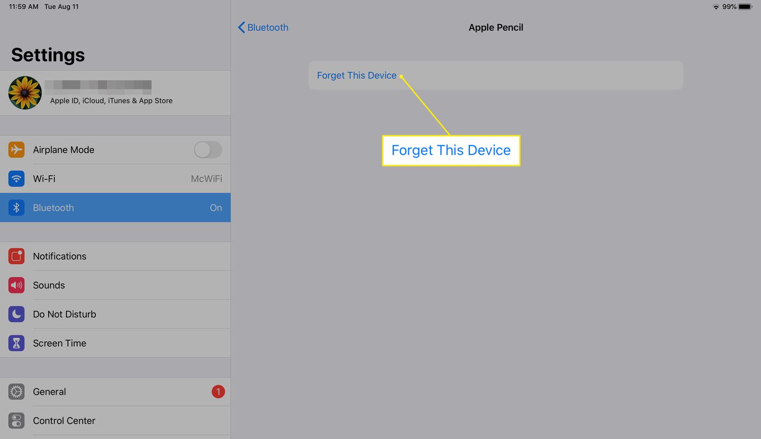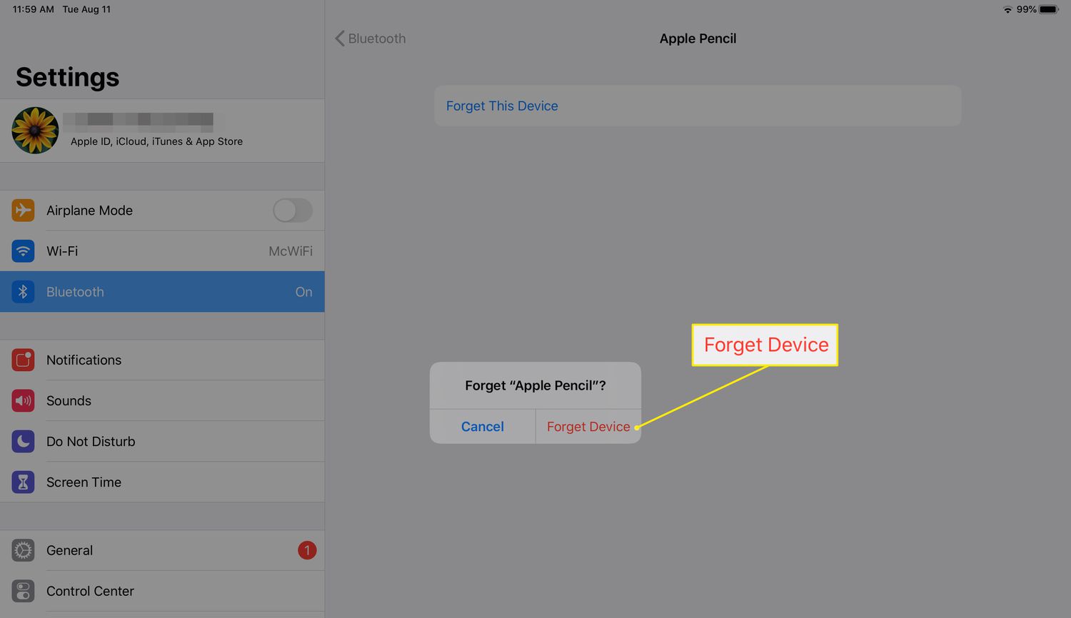 Confirm that you want the iPad to forget the pencil in the pop-up window by tapping Forget Device.