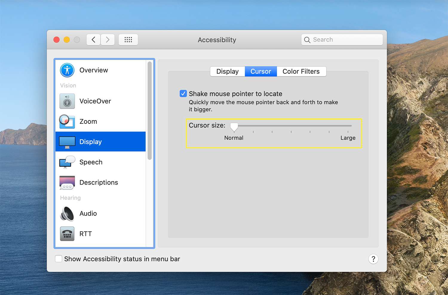 Enlarge the size of the mouse cursor to make it easier to see when you use Zoom. From System Preferences > Accessibility, select Display > Cursor size. Use the slider to adjust the size of the cursor. Whatever size you choose will remain even after you log out, restart, or shut down the device.
