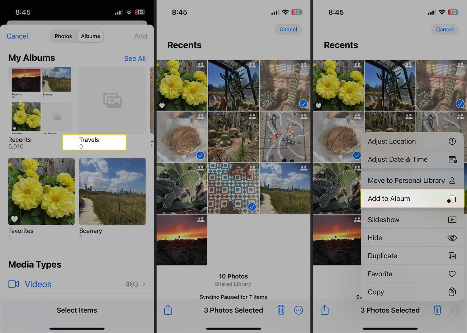 After you've made your selection, tap the three dots icon > Add to Album and choose the new album you set up.