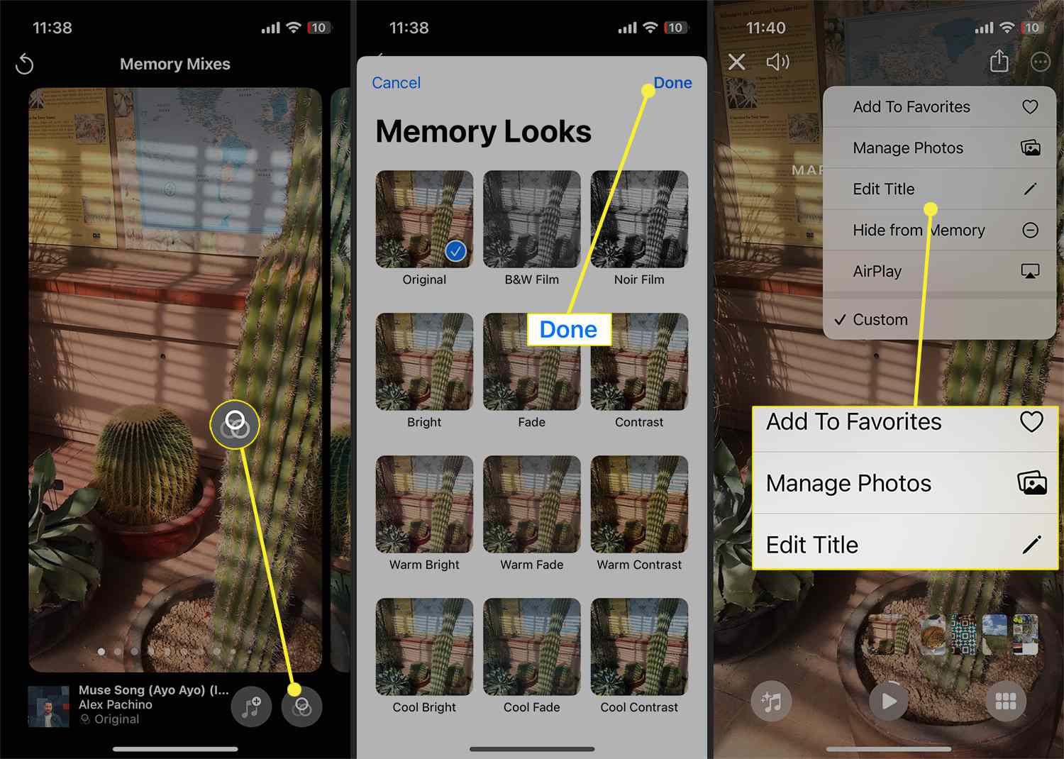 Select a color style for memories by tapping the Memory Looks icon, (three layered circles). Select Done to apply any edits.