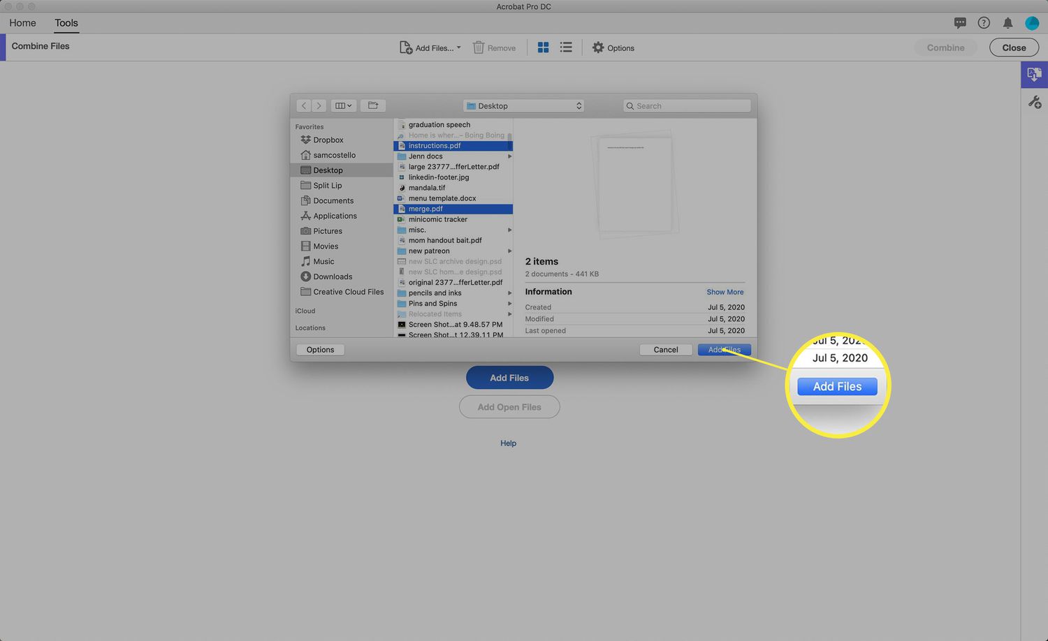 In the Finder window, navigate to and select the PDFs you want to combine > click Add Files.