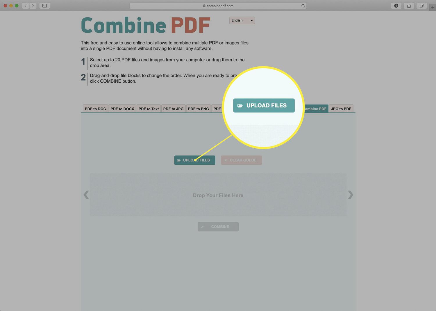 In your preferred web browser, go to the Combine PDF website. Click Upload Files.