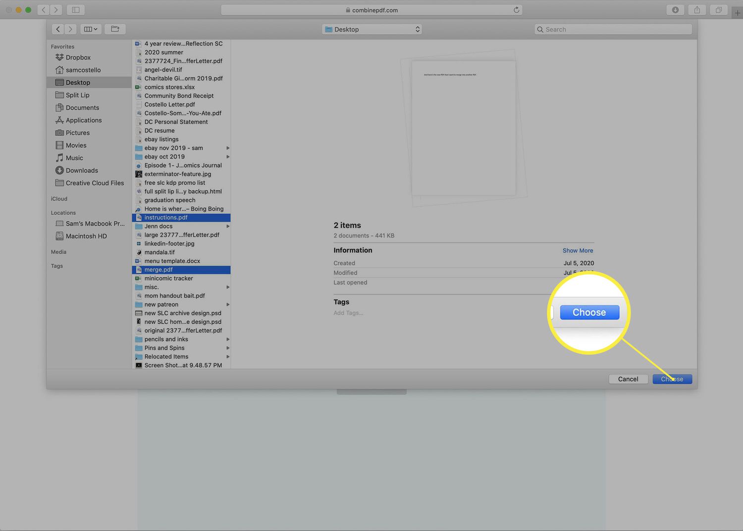 Navigate through your hard drive to find and select the PDFs you want to combine and then click Choose.