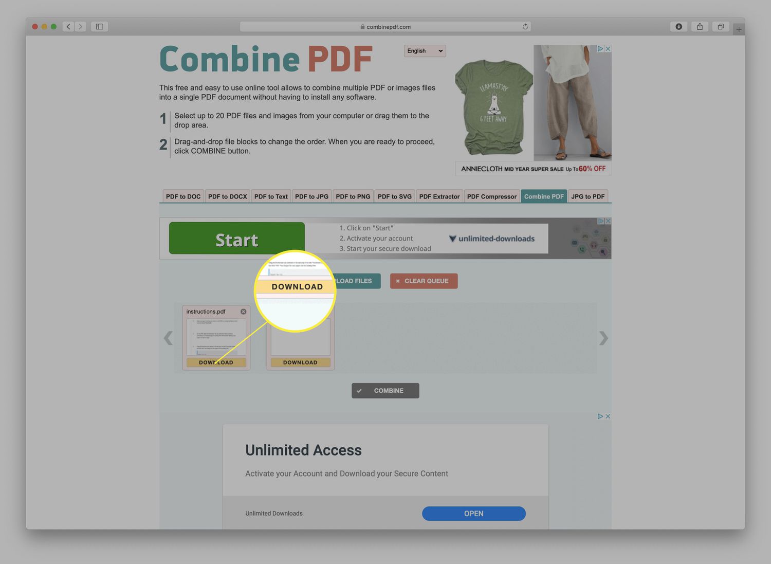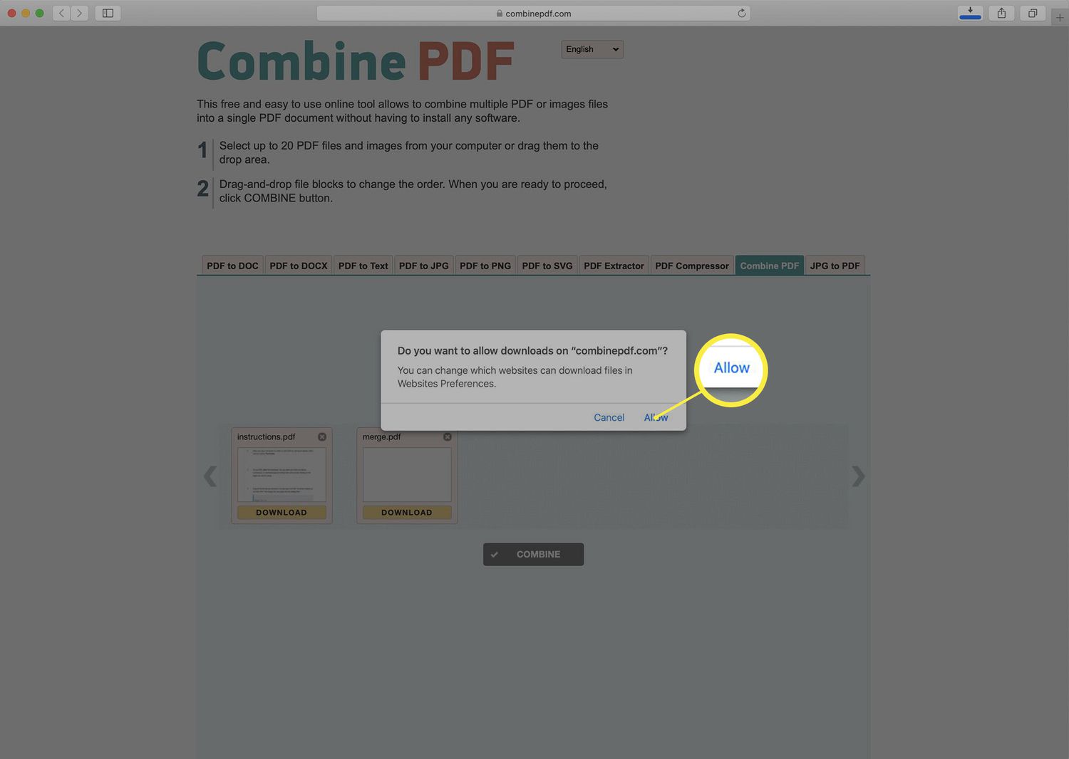 Click Combine to merge the PDFs (and, if your browser prompts you with a security warning, click Allow).