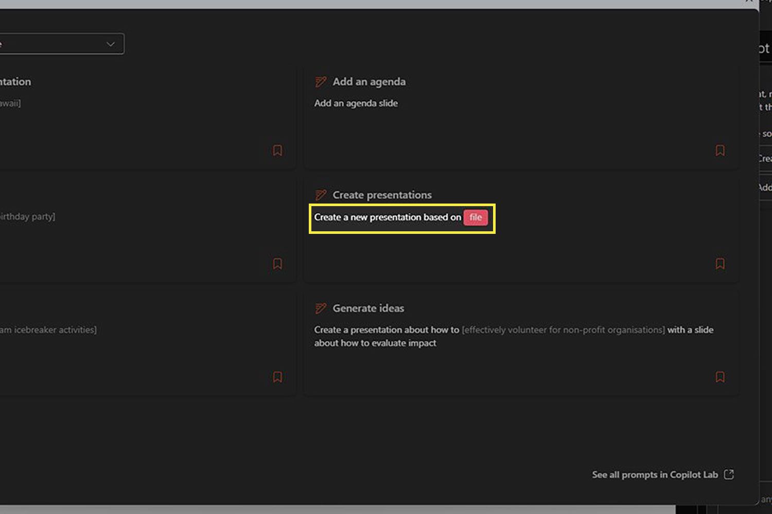 In this example, we had Copilot produce a guide on how to use Copilot in Powerpoint, using a link to Microsoft's explainer page about the technology.If you're unsure about how to write a prompt for Copilot, you can select the Prompt Book icon next to the Microphone at the bottom of the chat window. This will provide you with a number of pre-written prompts to select from.