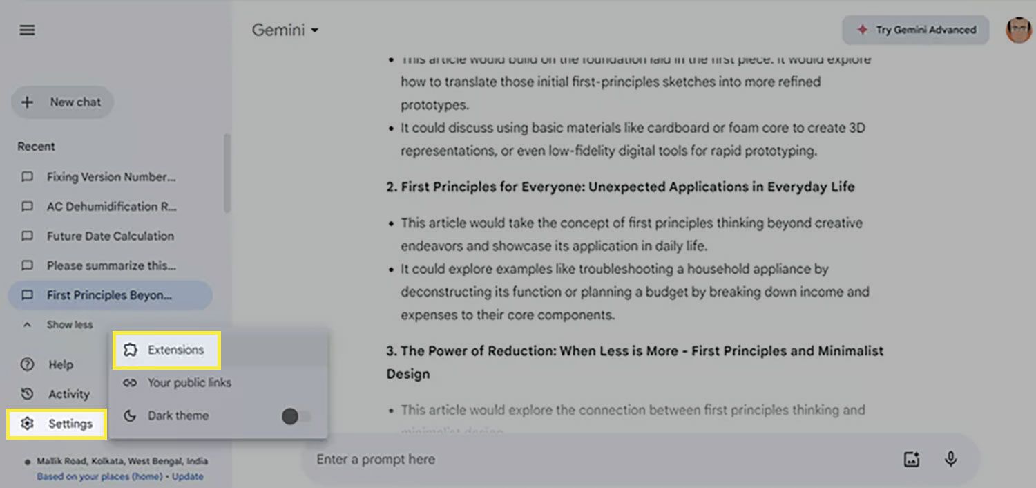 To automatically use any Google services as an extension, mention it in the prompt. Alternatively, enter @ and select the extension to allow Gemini to use a specific extension.