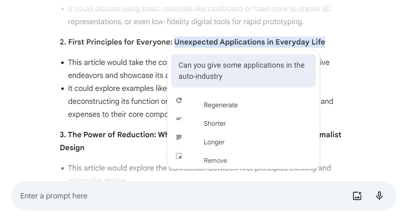 Enter a fresh prompt in the Modify with a prompt field to describe how you want the selected text to change, and then press Enter. The other options of Regenerate, Shorter, Longer, and Remove are self-explanatory.