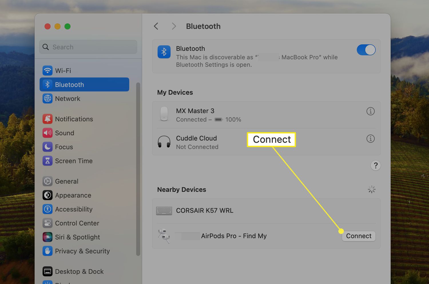 The AirPods will appear in the Bluetooth preferences window. Click Connect.
