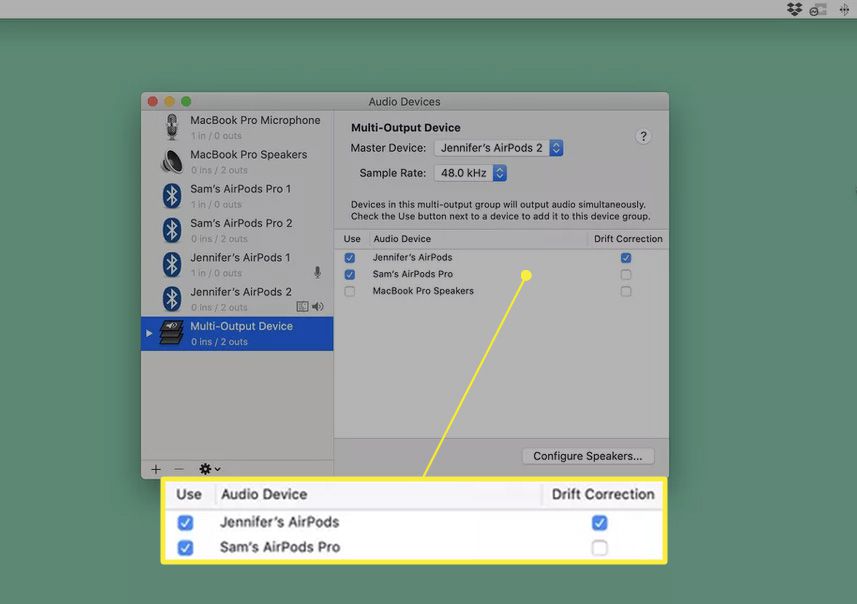 Check the box next to the two sets of AirPods. In the Master Device drop-down, choose your AirPods. Check the Drift Correction box next to your friend's AirPods.
