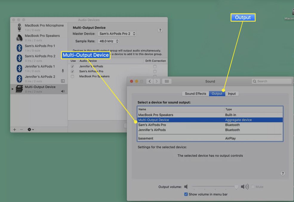 Go to the Apple menu > System Settings or System Preferences > Sound > Output > Multi-Output Device. With that done, the MacBook Air's audio is sent to both sets of AirPods.