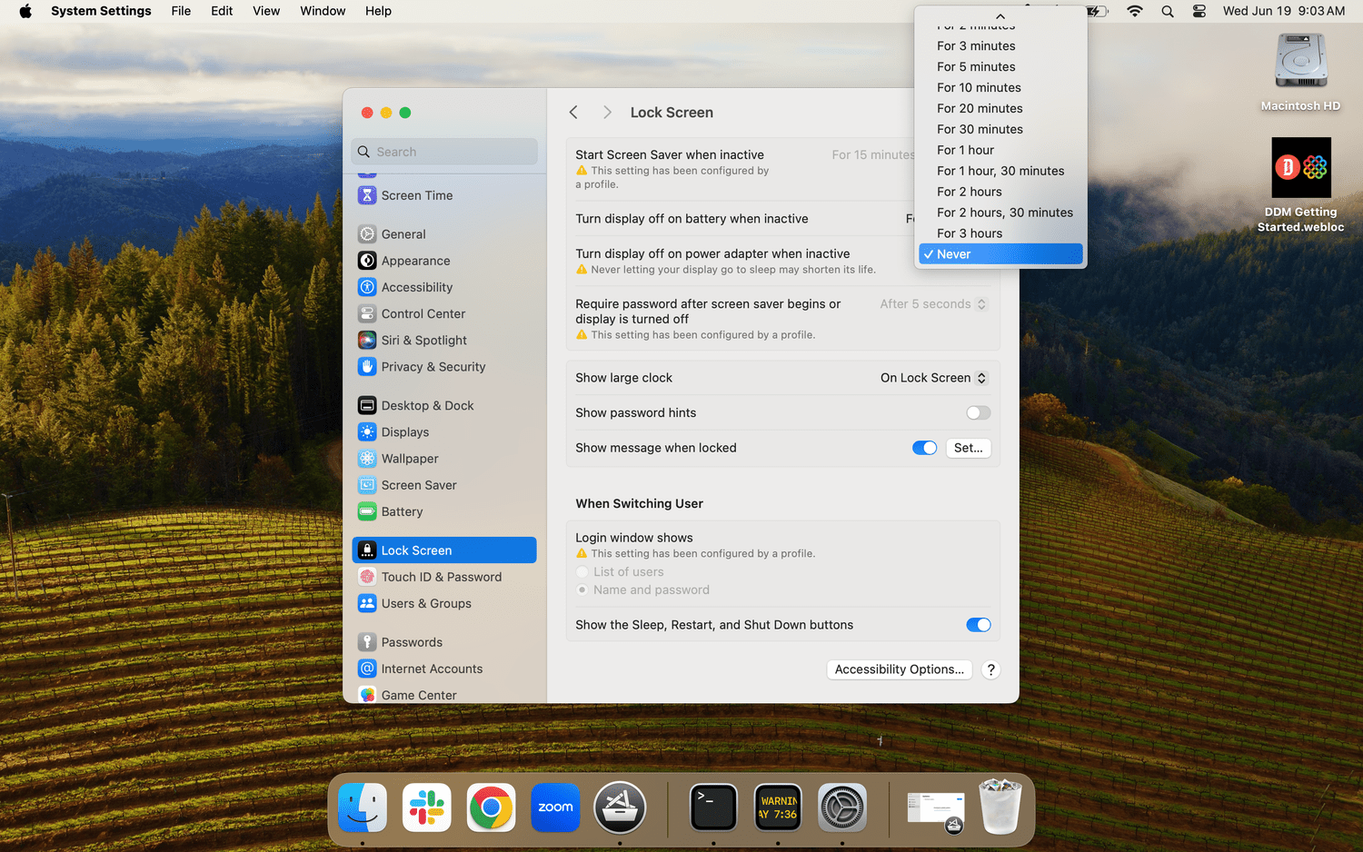 - System Settings > Lock Screen > Turn display off on power adapter when inactive > Never.